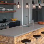 This rough-industrial look, so characteristic of lofts, combines raw, reclaimed timber panels and exposed storage spaces that perfectly match the vintage lighting pendants that bubble above this refined concrete surface.