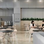 This inviting, cozy space is almost Zen-like in its minimalistic exactness, the grey walls contrasting the black furniture that blends well with the light-coloured floor, smooth wood, and nature-inspired surface echoing this diversity in balance.