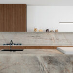 The dominant surface's numerous shades and spectacular capillaries illuminate the bright kitchen space. The overall simplicity of the robust design creates a precise and modern space.
