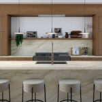 A modern kitchen in a classic space with wall and ceiling decorations. The meeting between them produces a sophisticated and beautiful transitional space. The perfect look is attained with the help of eclectic accessories.